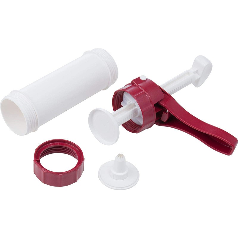 - Box contents: 1 x Westmark pastry press / garnish syringe, incl. 6 moulding discs, 6 nozzles, 1 adapter and 1 recipe booklet, with packaging, luxury, capacity: 225 ml, dimensions: 15 x 5, 8 x 20, 8 cm, material: plastic, colour: white/red, 32302260