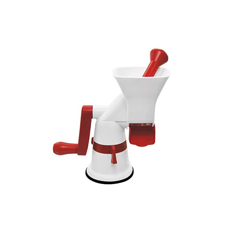 - Simply turn the handle and watch the seeds and skins separate from the pulp