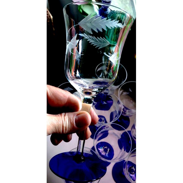 Stemmed Water Goblets or Large Wine Glasses in the WGL1 Cut pattern manufactured by the Weston Glass Company (aka Louie / West Virginia Glass Specialty Company). Each goblet features a round cobalt blue foot and clear gray cut fern/leaf bowl.