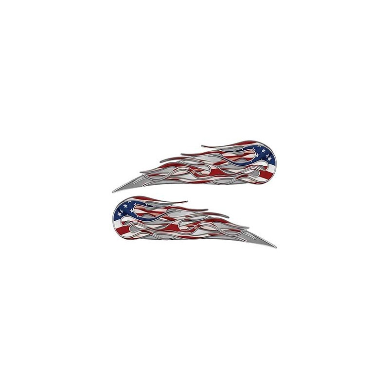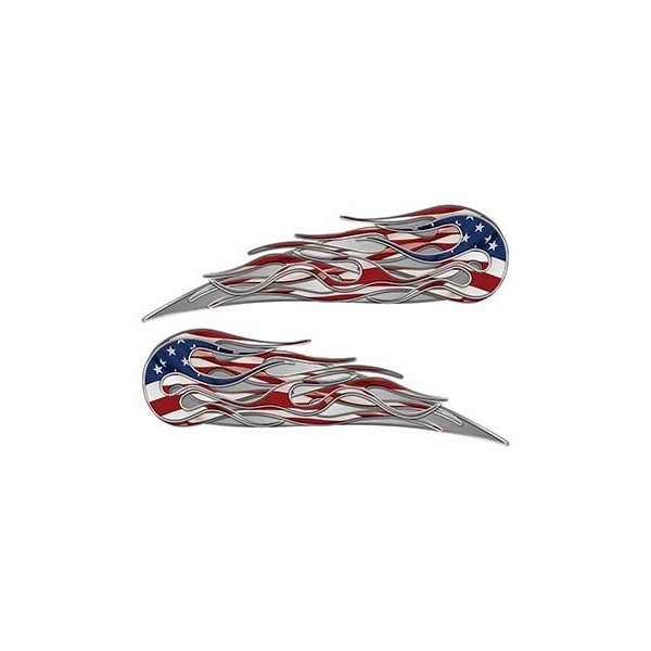 Twin Flame Motorcycle Tank Decal with American Flag from Weston Ink. Motorcycle or ATV Flame decal kits work for just about anything you want to add that extra look to. We have other sizes listed and work great for Trucks, Cars, Motorcycles, Bikes, Helmets, Golfcarts, ATV, Off road vehicles, SUV, or anything with a flat smooth surface. Designed and produced by Weston Ink using the highest quality materials and latest printing technology. New inks also extend the life of the graphic for years to come without any fading. These decals make a great factory replacement option for anyone looking for something a touch more personalized.