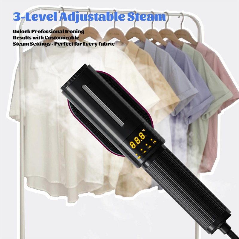 • High precision LCD intelligent display screen: Our steam hanging ironing machine boasts a high-precision LCD display, offering real-time, clear temperature readings. This intelligent feature enables precise temperature control, tailored to diverse fabrics like silk, cotton, denim, or wool. Accurate settings prevent fiber damage from overheating or ineffective ironing from low temps. Each garment receives optimal care and the finest ironing results, ensuring gentle treatment and impeccable appearance