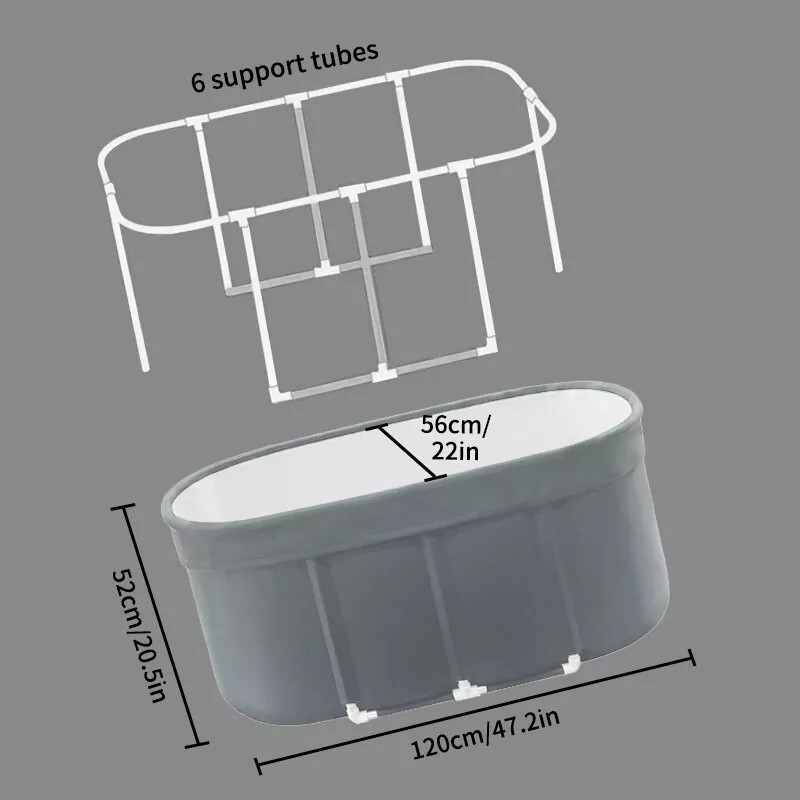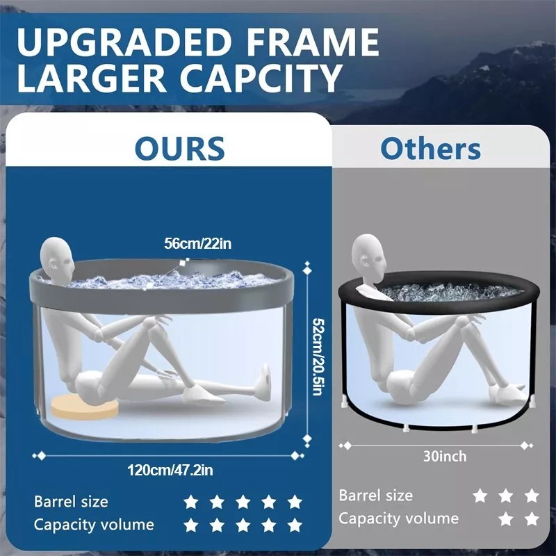 【Oval Ice Bath 】Our spacious oval ice bath allows you to fully stretch your legs without discomfort. With a capacity of 129 gallons, it offers plenty of room for rejuvenation. Supported by eight sturdy aluminum struts, it can hold up to 800 pounds and fit a variety of body types