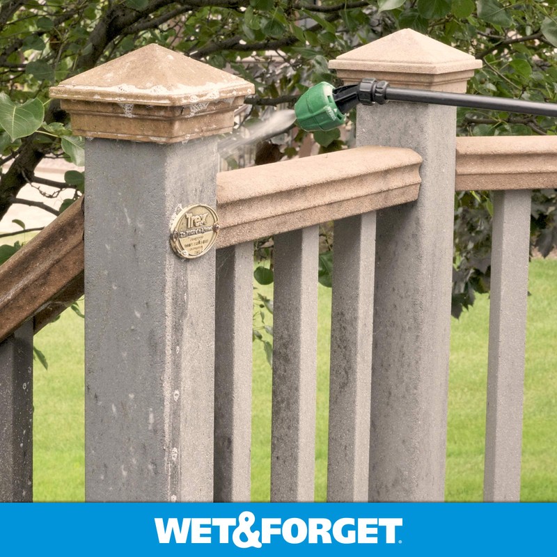 - Mix 1 part Wet & Forget with 5 parts water in a garden sprayer, spray dry surface on a cool day to avoid rapid evaporation of product, do not rinse, apply when rain is not forecasted within 4-5 hours, apply when the temperature is above 32° F; unused product can be stored mixed and ready in sprayer for future applications with unlimited shelf life