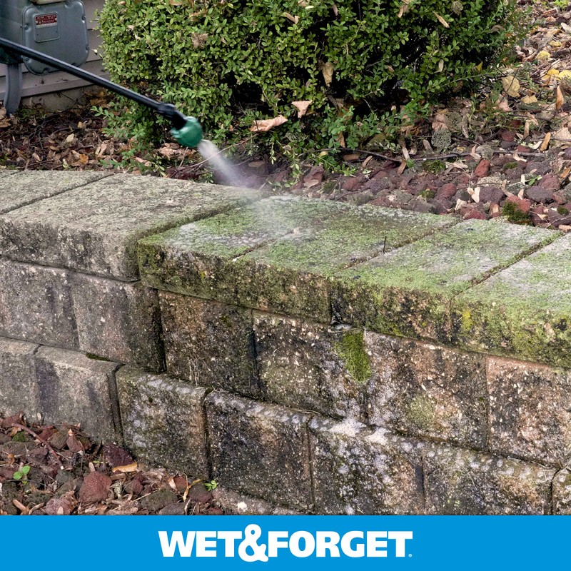 Wet and Forget has a unique combination of biodegradable selective surfactants for moss, mold and mildew stain removal on any exterior surface. When diluted with water and applied, it immediately penetrates the unsightly stain. Each time it rains, this safe, cleansing combination reactivates to gently lift the moss, mold and mildew stain without damaging the surface. Wet and Forget is an EPA approved one step process that requires no scrubbing or rinsing. It is non-acidic, non-caustic and contains no bleach. Be patient, Wet and Forget's gentle cleaning action takes time depending on how heavy the stain is and results are visible over time. Remember good things take time, and Wet and Forget continues to clean for up to a year. No special equipment is required. Just apply Wet and Forget with a pump-up garden sprayer. After the first application simply reapply Wet and Forget at the first sign of moss, mold and mildew stains returning. Wet and Forget can be used on any outdoor surface. Some examples of these surfaces are: asphalt (blacktop), Astroturf, aluminum siding, awnings, brick pavers, composite decking, concrete, driveways, docks, fiberglass boats, fiberglass shingles, fiberglass hulls/topsides, green houses, gutters, inflatable dinghies, limestone, marble, marinas, natural stone, outdoor furniture, outdoor planters, paint surfaces, patios, patio furniture, plastic houses, recreational vehicles, retaining walls, sails, sandstone, shade sails, sidewalks, stucco, tennis courts, teak decks, textured finishes, tiles, tombstones, umbrellas (outdoor), vinyl siding, wood.