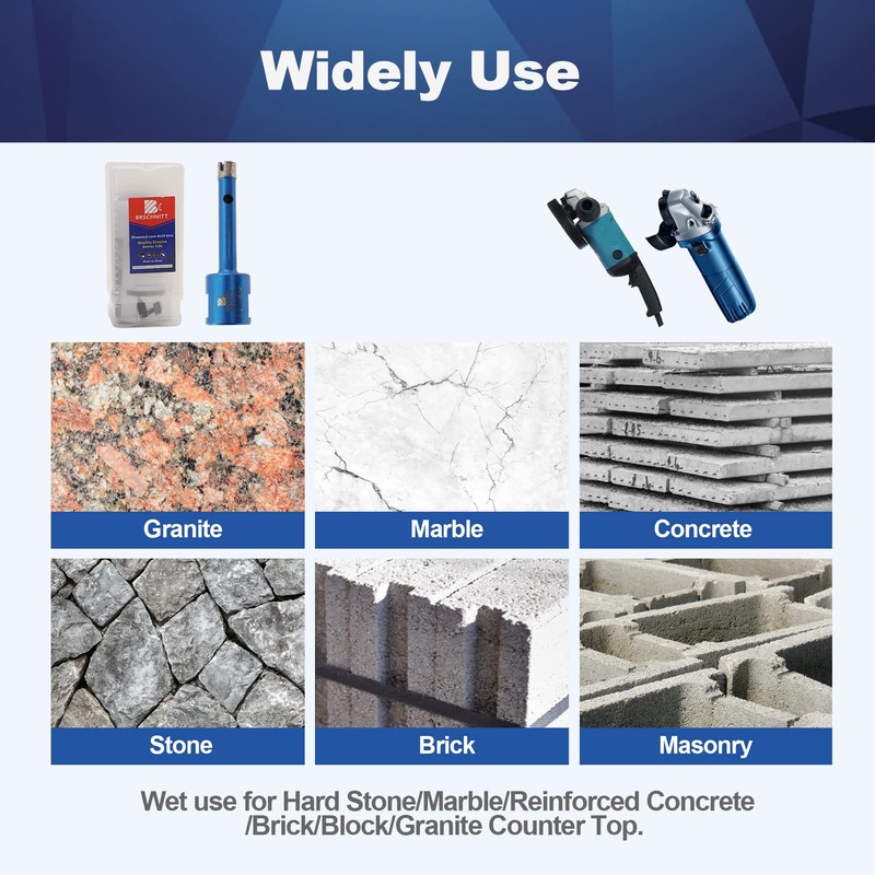 - Application---wet Diamond drill bit are worked great for wet drilling holes through Granite Marble Hard Stone Concrete Brick Block Counter Top.