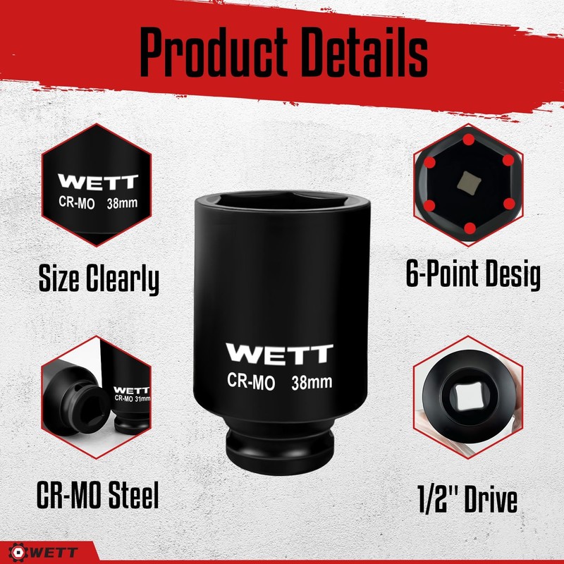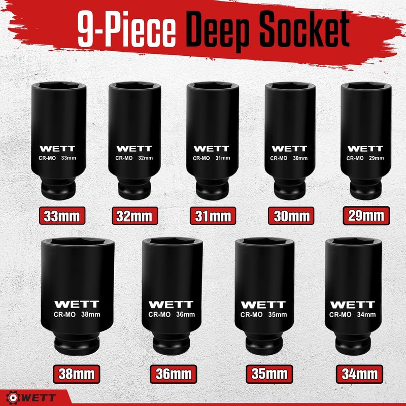 WETT 1/2" Drive Deep Large Impact Socket Set, 9-Piece Spindle Axle Nut Metric 6 Point Sockets Set, CR-MO, 29mm-38mm