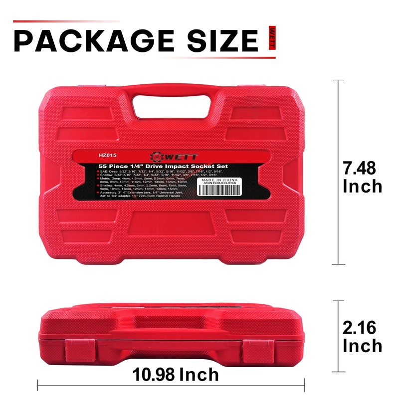 WETT 1/4" Drive Impact Socket Set, 55 Piece, SAE/Metric, Deep/Shallow, Cr-V Steel, 6 Point, (5/32"-9/16", 4-15mm) Sockets with Ratchet Handle, Extension bar, Adapter and Universal Joint