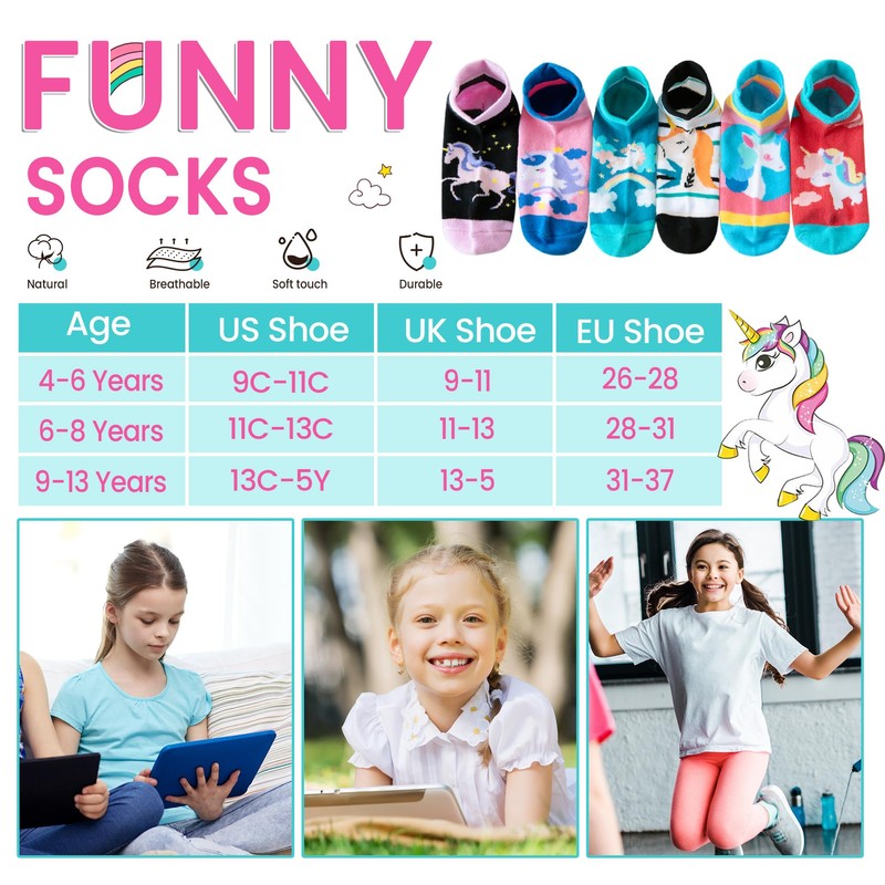 - Available in Multiple Sizes: To ensure the perfect fit for girls of different ages, these unicorn no show socks are available in three sizes: 4-6 Years, 6-8 Years, and 9-13 Years. This range of sizes guarantees that she can enjoy the comfort and style of these socks as she grows, making them a practical and long-lasting addition to her wardrobe.