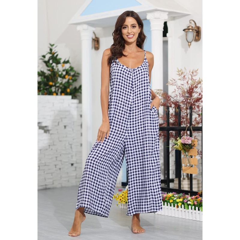 wexcen Overol casual con estampado floral para mujer, sin mangas, tirantes delgados, pantalones de pierna ancha con dos bolsillos, Azul marino (Plaid Navy), S