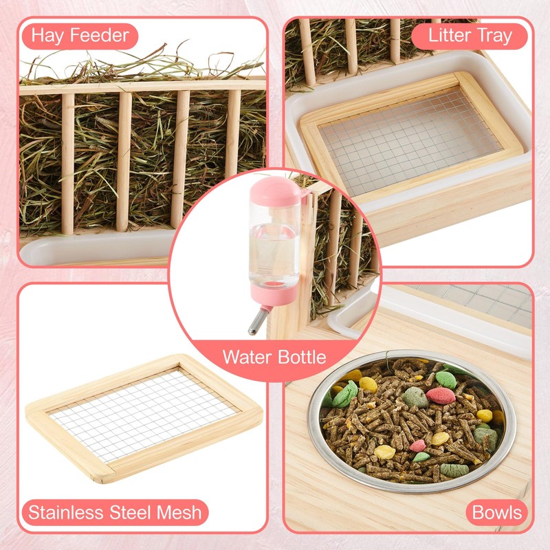 - Hassle Free Assembly: with a package that includes a hay feeder, a water bottle with a stand, a removable litter pan, and two bowls with stands, this rabbit hay feeder is almost fully assembled; Simple connections make setup a breeze, so your pets can enjoy it in no time