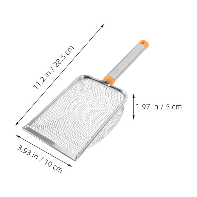 - 【Perfect Design】Stainless Steel Mesh Shovel Long Handle Deep Shovel Kitten Feces Screening Cleaning Cat Litter Box Kitten Feces Lifter Fine Mesh Design with Tight Holes for Cleaning Reptile Excrement or Container Corners.