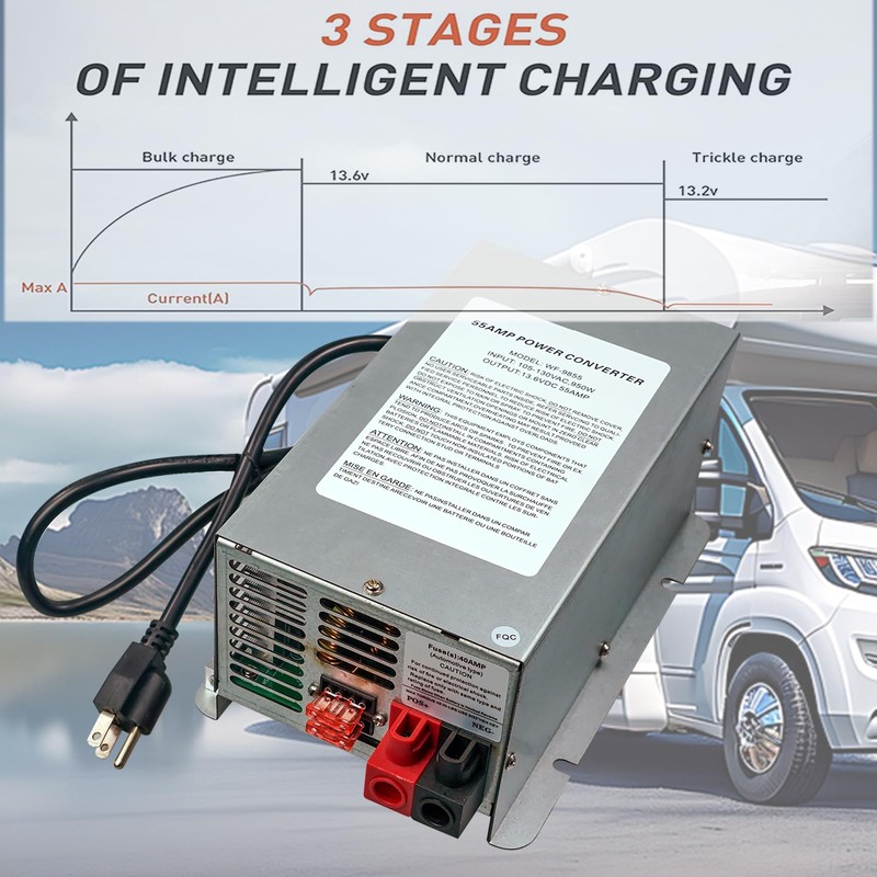 - 【Three-Stage-Charging】This RV power converter adopts Three-Stage Converter Charger;The converter will increase the voltage of your battery to 13.6 Volt and then enter trickle mode;In this mode, the converter maintains the battery level at all times
