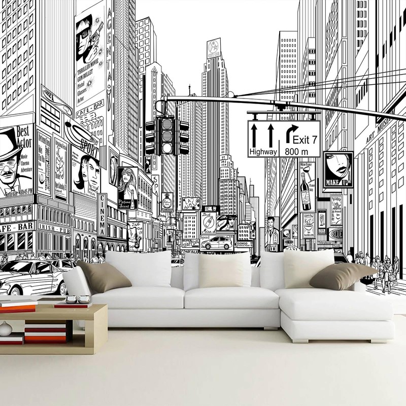 WFBHUA-Black and White New York City Wallpaper Hand Painted Times Square Wall Mural Decoration for Living Room Bedroom Offices(Not Peel and Stick)