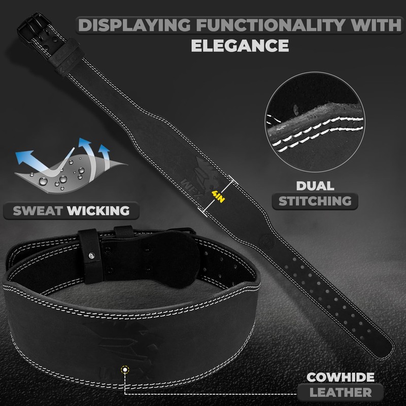 - PREMIUM COWHIDE LEATHER: The foundation of this weight lifting belt is its superior-quality cowhide leather. This material not only ensures durability but also lends a classic aesthetic to the belt.