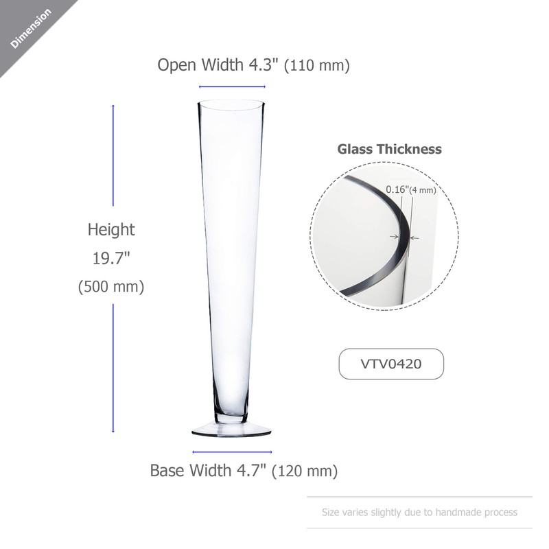 Clear Pilsner Trumpet Glass Vase / Center piece - Open: 4", Height: 19". All Glassware are originally hand made and cut in metric, we converted measurement to inches, so there may be slight discrepancy, if you need exact detailed measurement, please contact us for exact measurement.