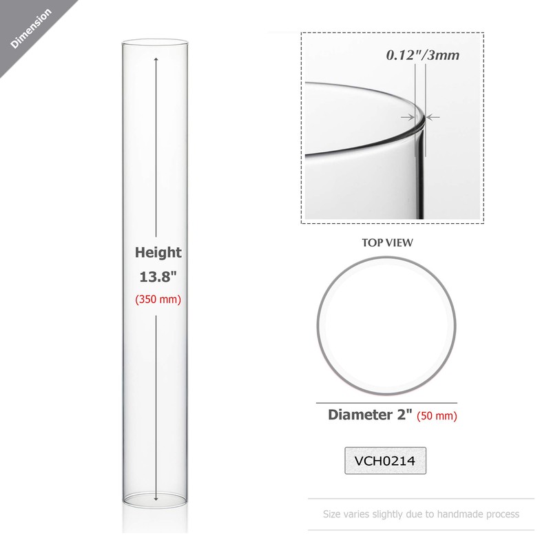 WGVI Hurricane - Funda para velas, ancho de 2 pulgadas, altura de 14 pulgadas, portavelas cilíndrico de vidrio transparente, tubo de chimenea, visualización de vela de extremo abierto, 1 pieza