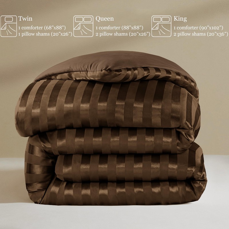 Whale Flotilla 3-Piece Reversible Silky Soft Queen Comforter Set, Luxury Stripe Satin Comforters Full Size Bedding Set with 2 Satin Pillowcases, Lightweight Duvet Set for All Seasons, Brown