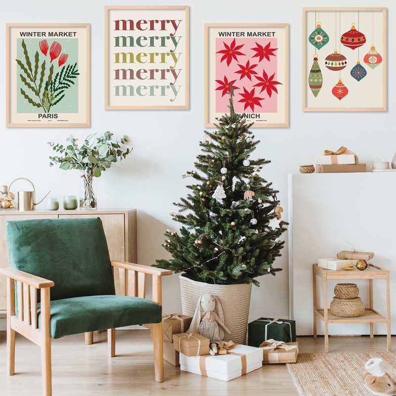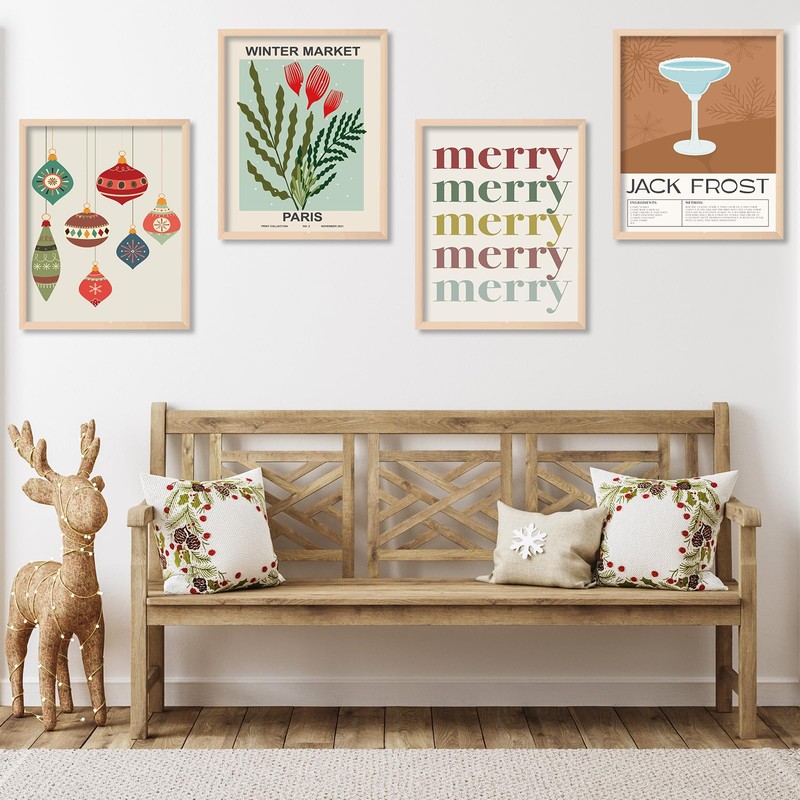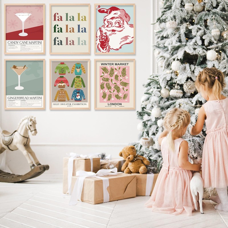 - Diseño retro: estos carteles de arte están diseñados con temática navideña, todos en diferentes estilos, impresos con Papá Noel, cóctel, las palabras de alegría y más, delicados y clásico, creando un ambiente único.