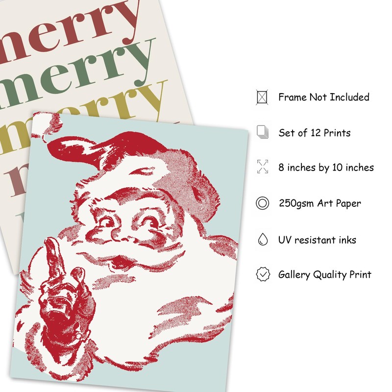 Whaline - 12 impresiones artísticas de Navidad para pared de Papá Noel, papel de cóctel, decoración de pared estética, decoración clásico para decoración de la galería del hogar, 8 x 10 pulgadas (sin