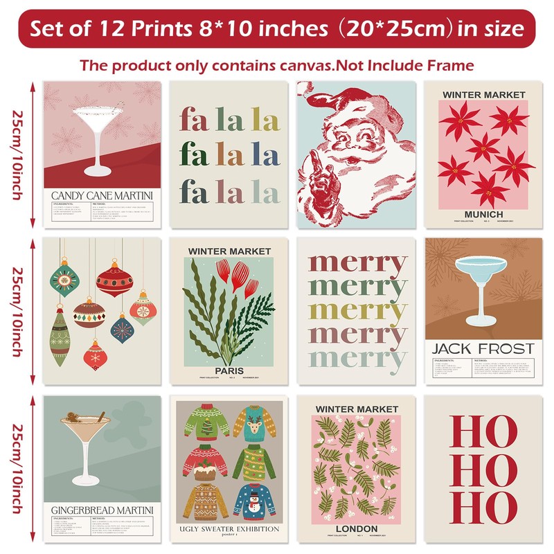 - Lo que obtendrás: el paquete incluye 12 impresiones artísticas de pared de Navidad, cada impresión mide aproximadamente 20 x 25 cm, el tamaño grande es bastante adecuado para decoración de pared y marcos de fotos. Ten en cuenta que no están enmarcados.