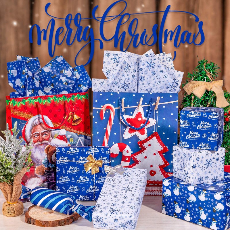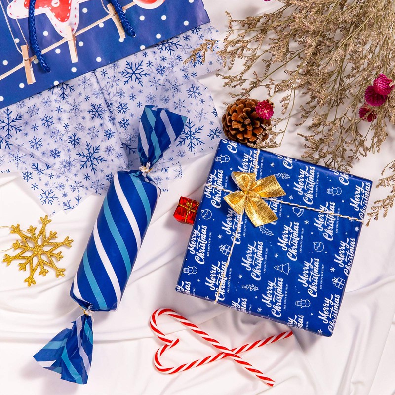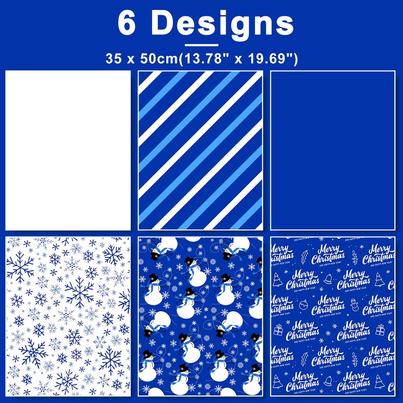 - BLUE CHRISTMAS PAPER- 6 different styles Christmas tissue papers, 2 of which are colored in solid white and blue, the other 4 are patterned with snowman, snowflakes, line and the words of happy Christmas, with popular Christmas elements, romantic and elegant, full of the charm of winter and Christmas holiday.