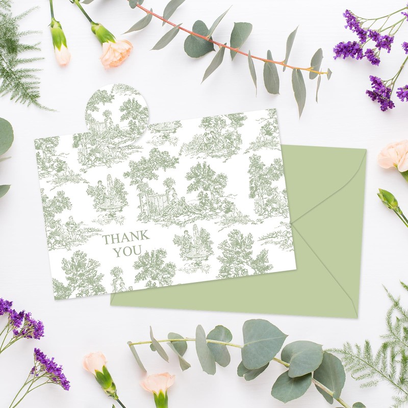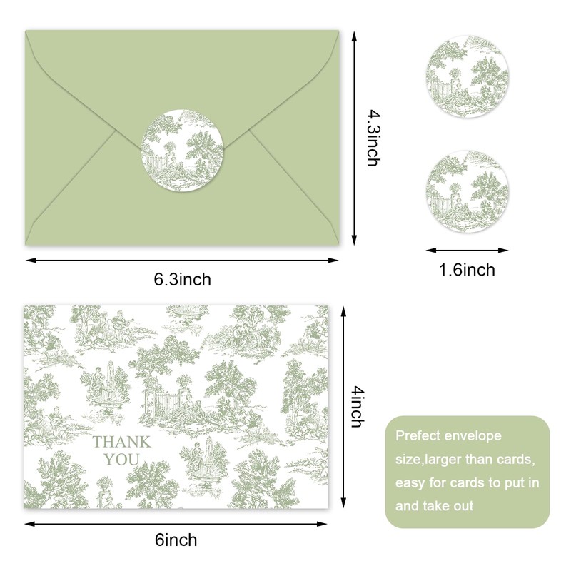 - You Will Get: 36 pcs thank you cards, 36 pcs envelops and 36 pcs stickers are included in the package, they are printed with french country scene, and colored in sage green, well meet your various needs and express your sincere gratitude