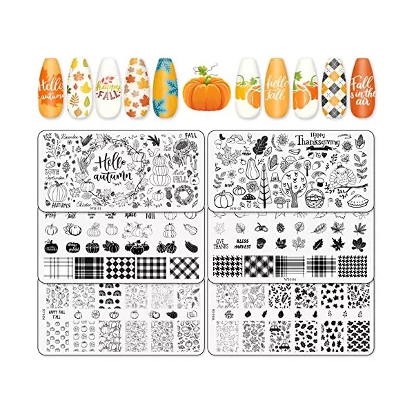 Juego de 6 platos para estampar uñas Whaline con tema de Acción de Gracias de otoño, varios patrones, colección de calabazas y arce, colección Autumn Blessing, para el Día de Acción de Gracias, diseño de arte de