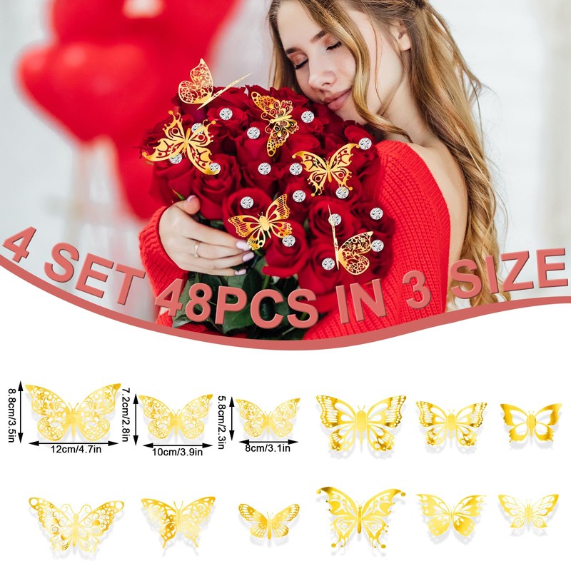 - You Will Get - 100pcs rhinestone flower pins, 48pcs gold 3D butterfly ornaments and 15 sheets of flower wrapping paper are in the package, abundant and rich enough to meet your decoration needs.