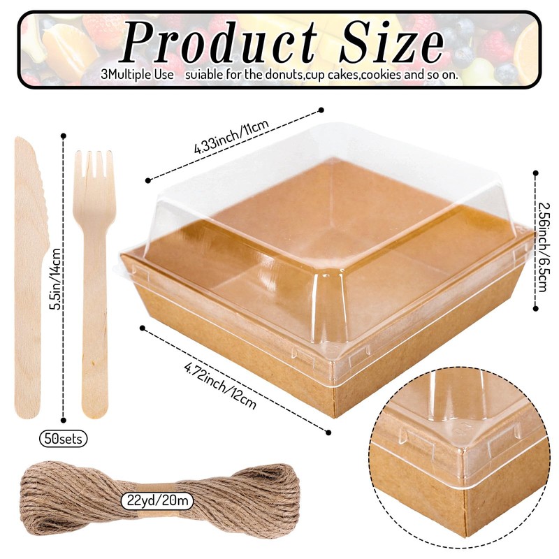 Whaline Whaline 50Pcs Small Charcuterie Boxes with Clear Lids Kraft Mini Dessert Boxes with Forks and Knives 5 Inch Square Disposable Food Containers for Sandwich Cookie Sushi Cake Slice Strawberries