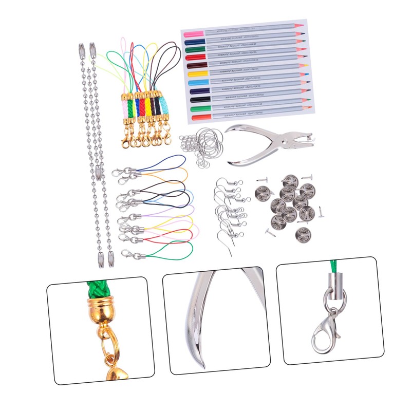 20 x Shrink Film Sheets 12 x Colored Pencils 1 x Hole Punch 10 x Fixing Heads 5 x Bead Chains 10 x Ear Hooks 100 x Open Jump Rings 30 x Key Rings