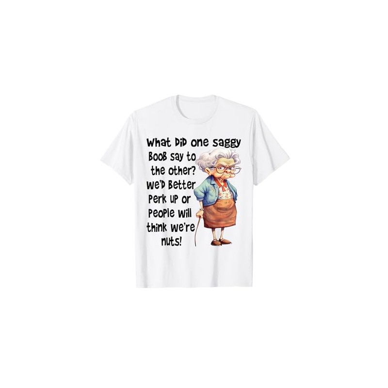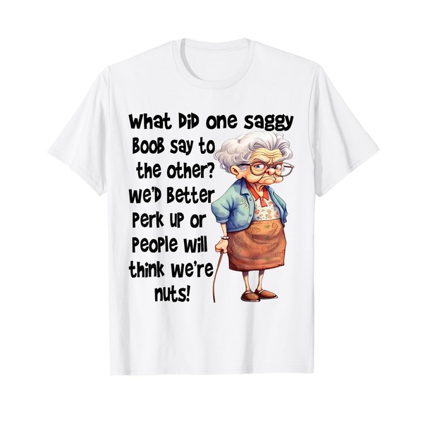 - What Did One Saggy Boob Say To The Other We'd Better Perk Up Or People Will Think We're Nuts Tee Features a hilariously grumpy grandma with attitude and sass. Funny Humor Sarcastic Tee for Men, Women, Mother, Mom, Daughter, Sister, Friends, Family.