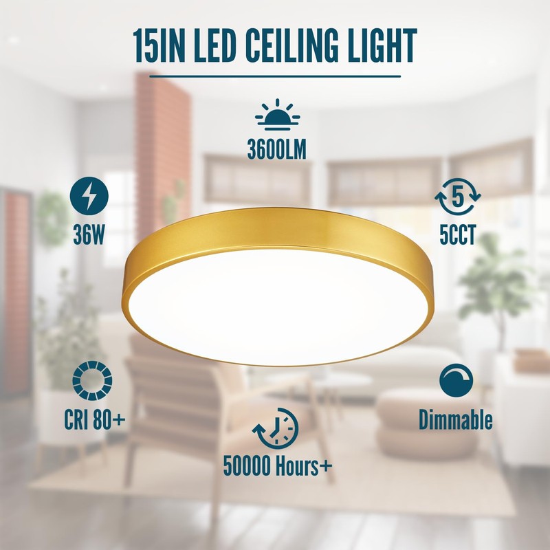 - 🌟【Wheatronic15 Inch 36W Gold Round Flush Mount Light Fixture Overhead】This LED living room light fixture Ceiling Mount features an integrated LED panel, with a power consumption of only 36W (equivalent to 120W), it delivers a bright output of up to 3600 Lumens. The 15 inch LED gold drum bedroom ceiling light gold to traditional bathroom ceiling light not only provides even and brilliant illumination but also helps you save significantly on electricity bills of the modern light fixtures ceiling. Moreover, this gold led ceiling light flush mount offers a flicker-free, non-glare, and non-buzzing lighting experience, ensuring optimal eye comfort and reducing eye fatigue for your family.