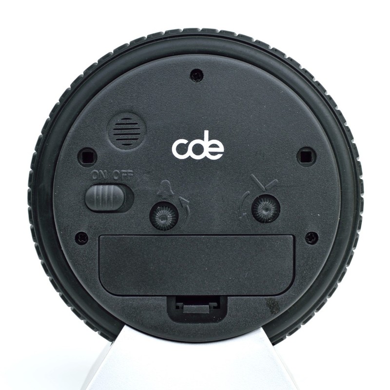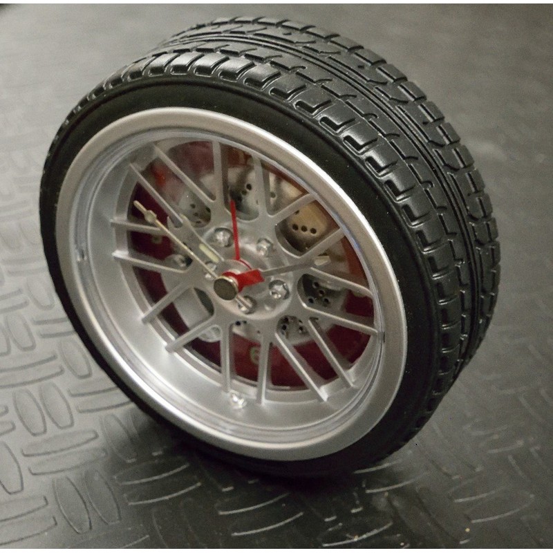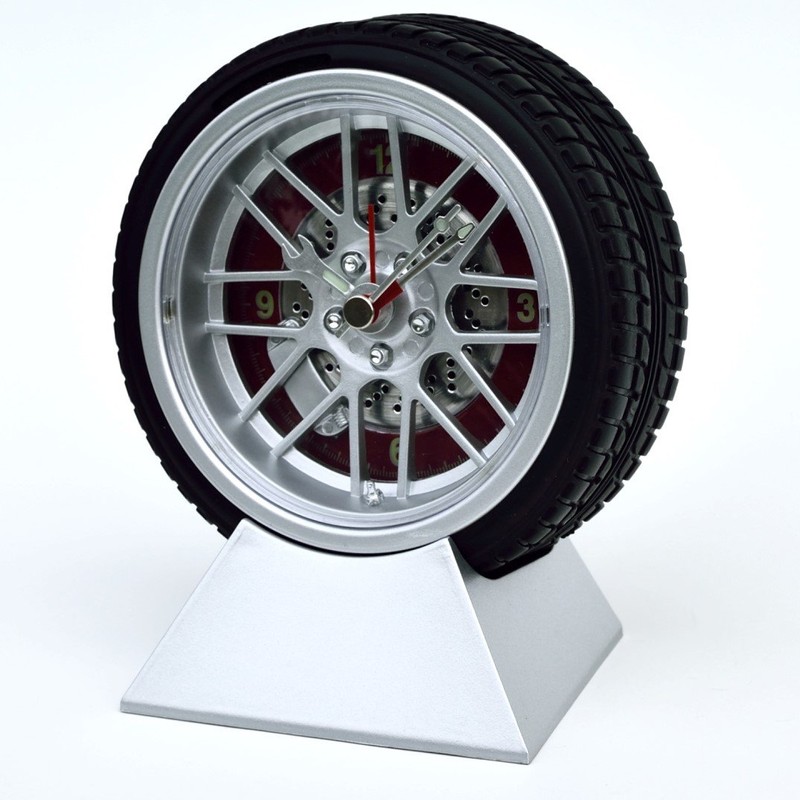 This stylish tire desk clock is a must for any automotive enthusiast. With a red background and cross drilled rotors, this clock features a crescent wrench for the hour hand and a flathead screwdriver for the minute hand. Low profile tire has side marking of 245/40ZR 18. The tire clock is also removable from the base, allowing you to roll it around as you please. Measures 4.5" tall on base, 4" tall when not on base. Requires 1 AA battery (not included).