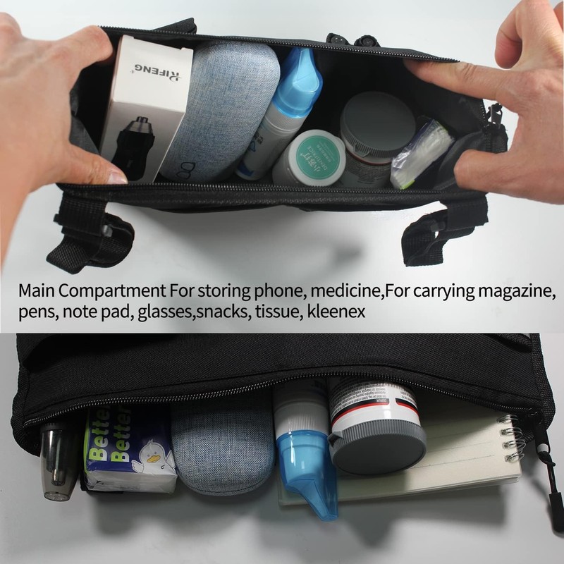 - 【 Durable, Light and easy to use 】Double seam of wheelchair bag on both sides to strengthen the stress point. Made of heavy duty nylon, this armrest organizer wheelchair is durable and can withstand years of daily use. To clean, simply wipe the waterproof nylon with a damp cloth.You can easily attach and remove wheelchair accessory bag with durable adjustable binding.