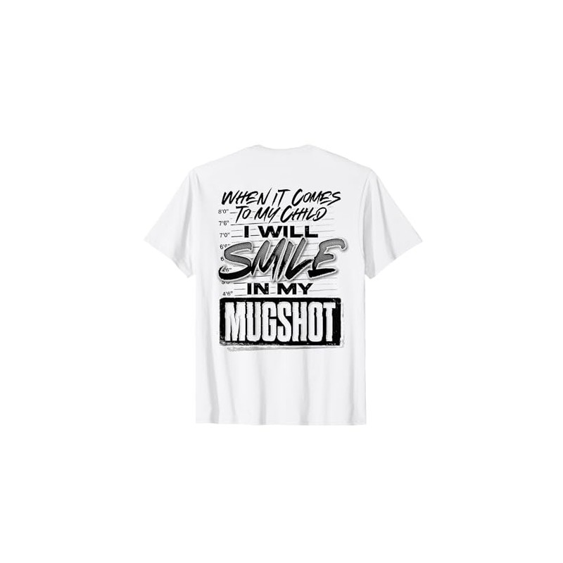 - When It Comes To My Child I Will Smile In My Mugshot (BACK) Humor Funny Sarcastic Tee for Men, Women, Family, Mom, Dad, Father, Mother, Wife, Girlfriend, Friends, Girls, Boys, Guys, Her, Him.