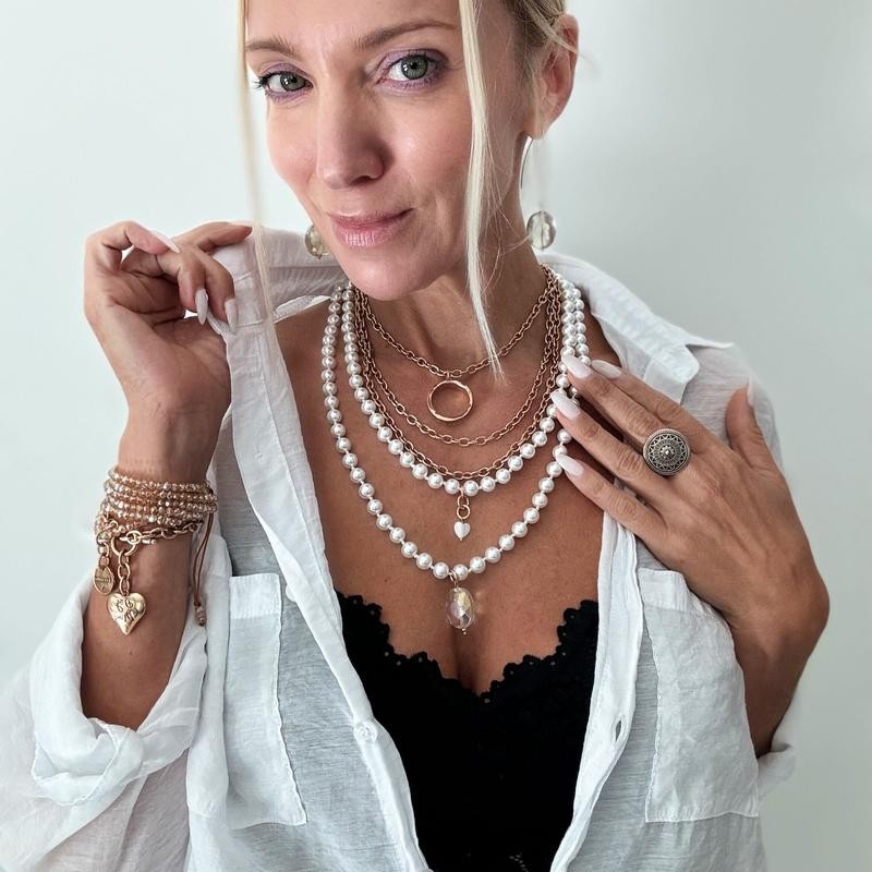 This Bundle Includes: (1) Fusion: 40" 8mm white pearl beads with faceted crystal and pearl heart (no pendant) (1) Essential: 48” 7mm layering chain with ring pendant, message inscribed