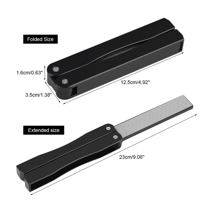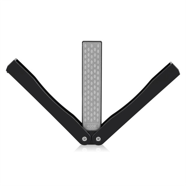 This double-sided sharpening stone is more convenient to use than the normal one-side item. 400# for coarse grinding and 600# for fine grinding. Folding design for portability when go camping or hiking.