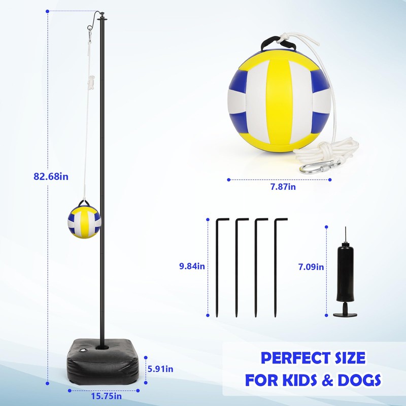 - Portable Tetherball Set: Equipped with bottom and top poles, 4 adjustable metal poles, a metal base, 4 ground spikes, 1 tether ball and rope, a pump (including needle) and all hardware.