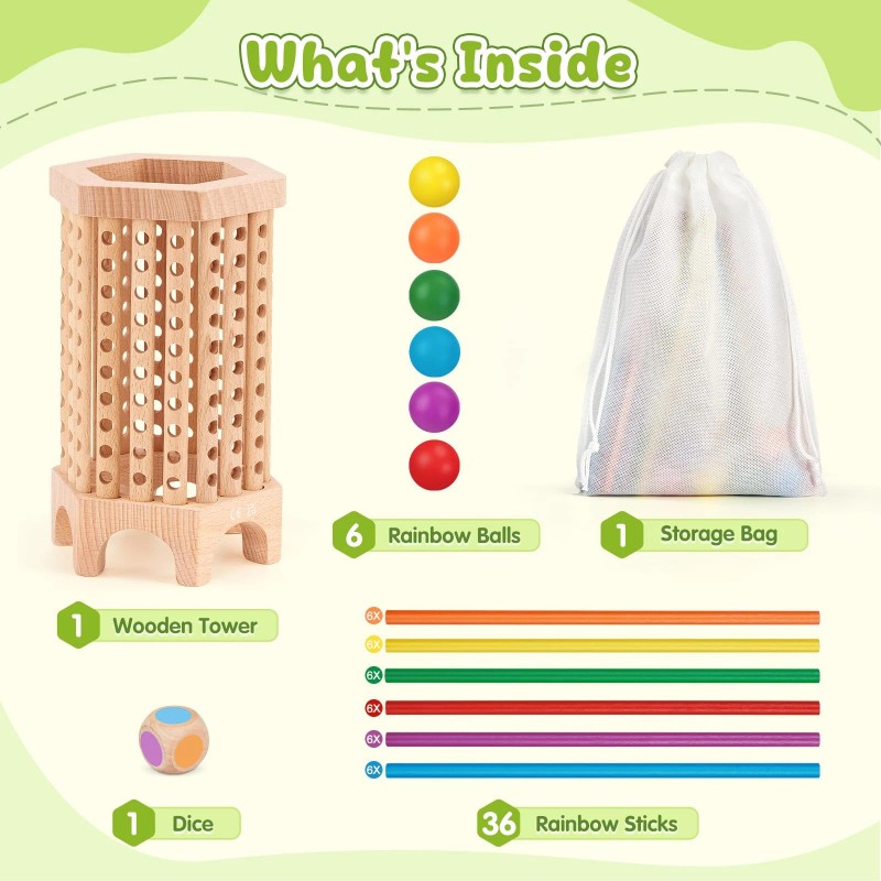 Premium Natural Materials – Made from high-quality beech wood with non-toxic, child-safe paint for vibrant colors and long-lasting durability. The wooden sticks are designed for easy gripping, and the smooth, polished tower ensures safe play with no sharp edges.