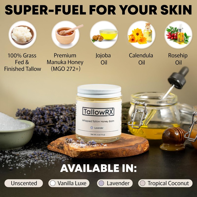 Crafted with 100% grass-fed beef tallow, organic Manuka honey, and other clean, organic ingredients, this balm delivers deep hydration and essential nutrients to your skin. It’s a premium choice for achieving a soft, radiant complexion with the benefits of tallow-based skincare. -