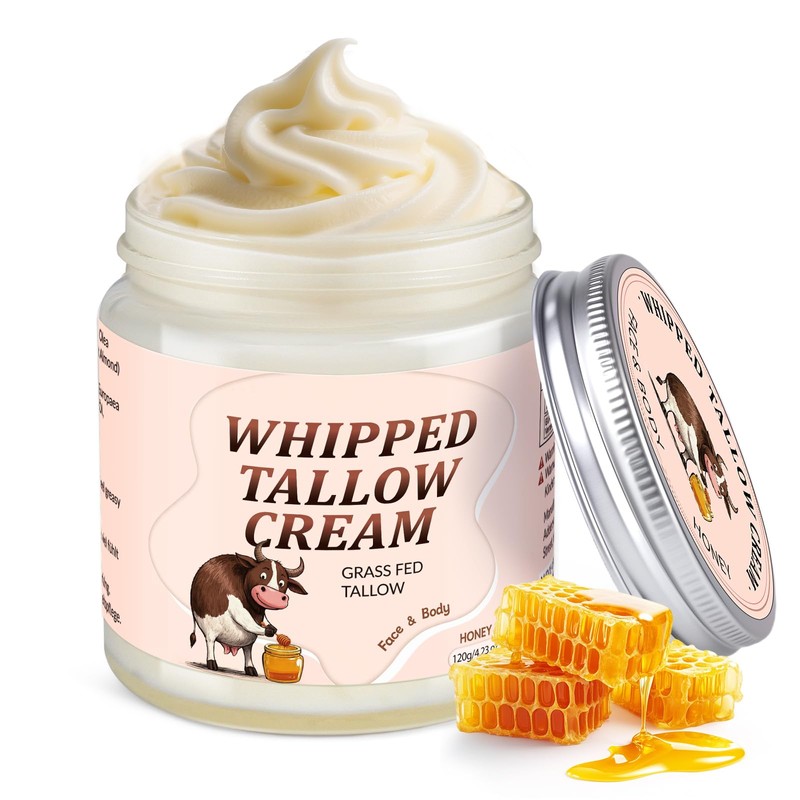 - 100% natural ingredients and zero load: from the farm to your home. Full oil formula with agricultural artisanal production. This whipped sebum cream uses 100% grass-fed beef suallow, shea butter, Olea Europaea (olive) fruit oil, sweet almond oil and nothing. It contains a rich source of vitamin A and vitamin E, which are important for skin health. Vitamin A helps maintain normal skin function and promotes skin cell regeneration, while vitamin E is a powerful antioxidant that protects the skin from free radical damage and slows skin ageing.