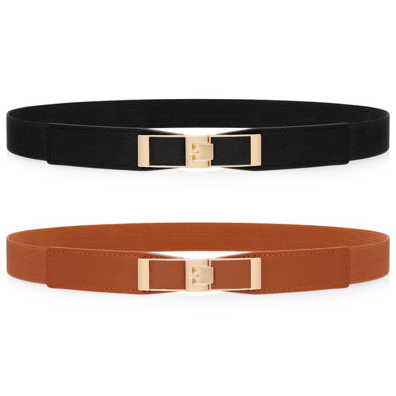 WHIPPY 2 Pack Women Skinny Elastic Belts Ladies Thin Stretch Waist Belt with Gold Buckle for Dresses Suits, Black+Brown, XL