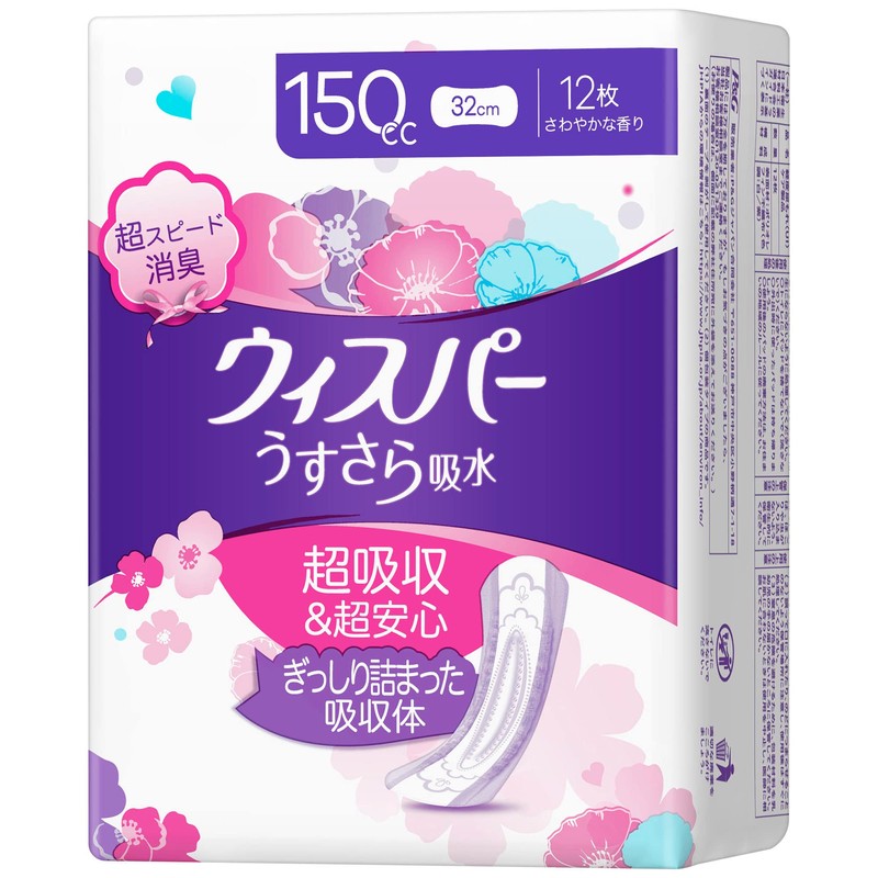 Whisper Ultra-Smooth Water Absorption 5.1 fl oz (150 cc), 12.6 inches (32 cm), 12 Pieces (For Women, Water Absorption Care, Urinary Leak Pads)
