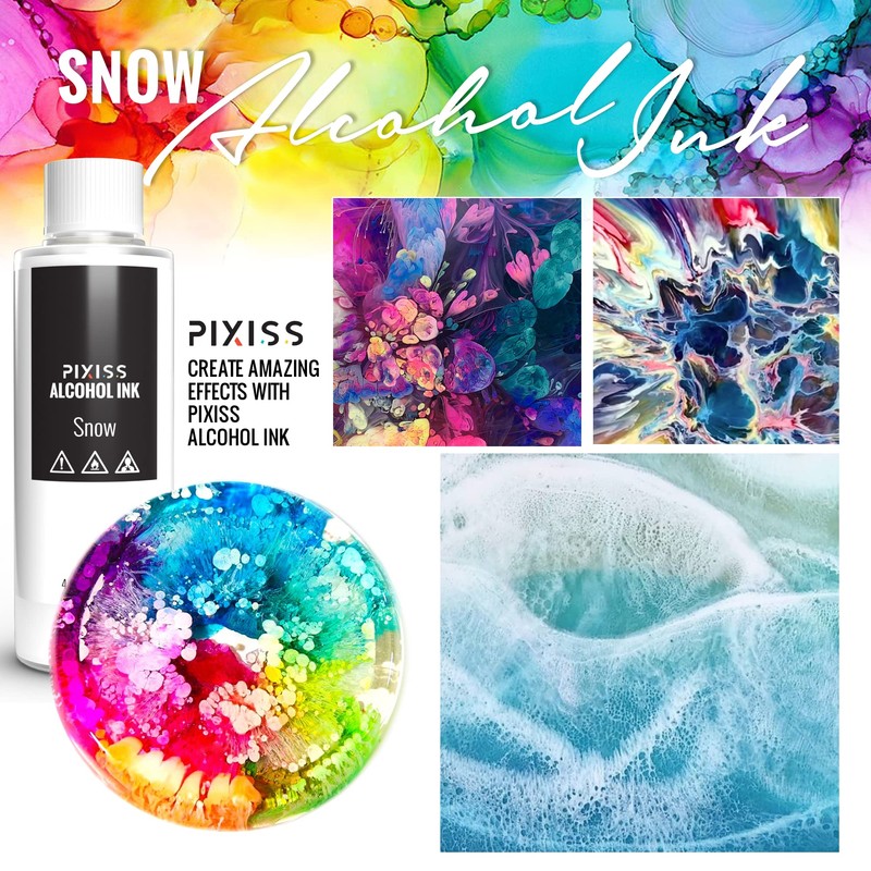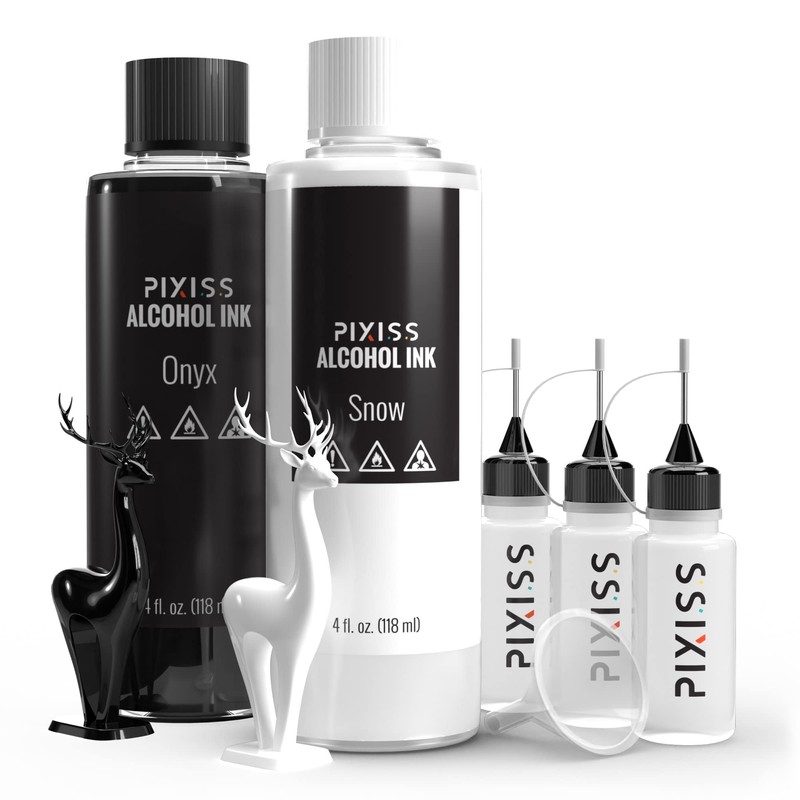 - Pixiss Alcohol Ink - White and Black Alcohol Ink by Pixiss, professional and versatile ink that produces color-saturated and acid-free results, 4 fluid ounces. Beautiful color that is acid-free and transparent. Comparable to onyx and pitch black as well as snow and blanco colors.