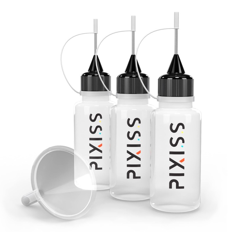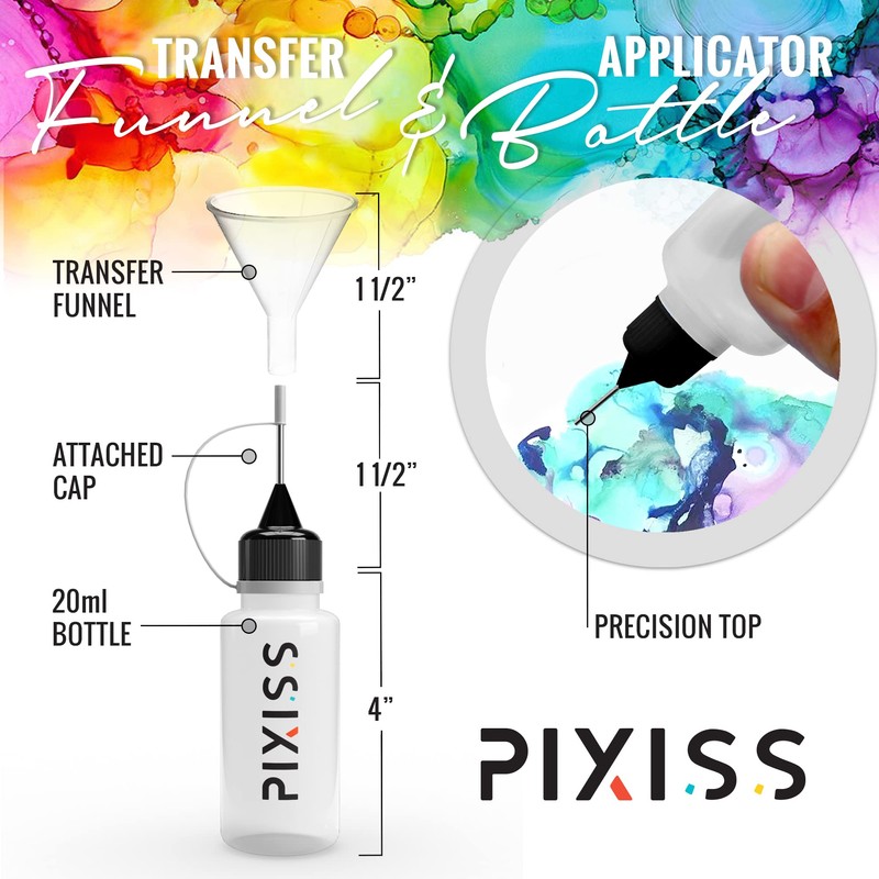 - Pixiss Applicator Bottle & Funnel - 20ml (0.68oz) semi-clear applicator bottle with a needle tip for precision use. Flexible rubber cap fits tight over the applicator needle to keep your ink from drying out or spilling. 1.5 inch plastic funnel for pouring the larger 4oz ounce alcohol ink in to smaller bottles.