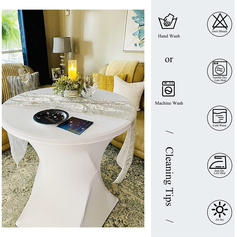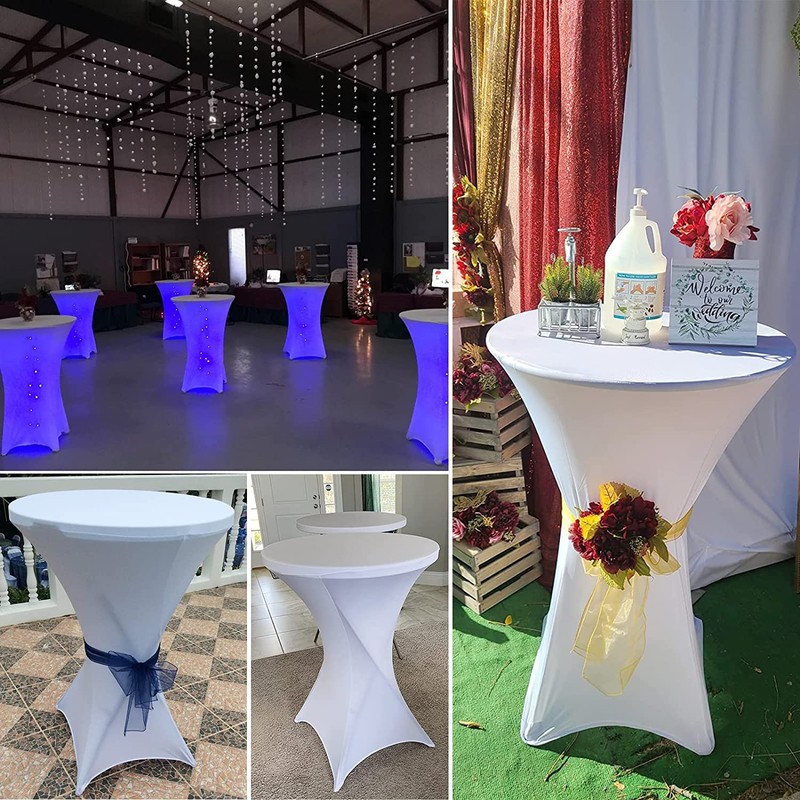 - Package includes: you will receive 1 pack white cocktail spandex stretch table cloths with square corners. The round elastic spandex tablecloth is made of 5% spandex, 95% polyester. They are stretchy and more durable than other traditional tablecloths.