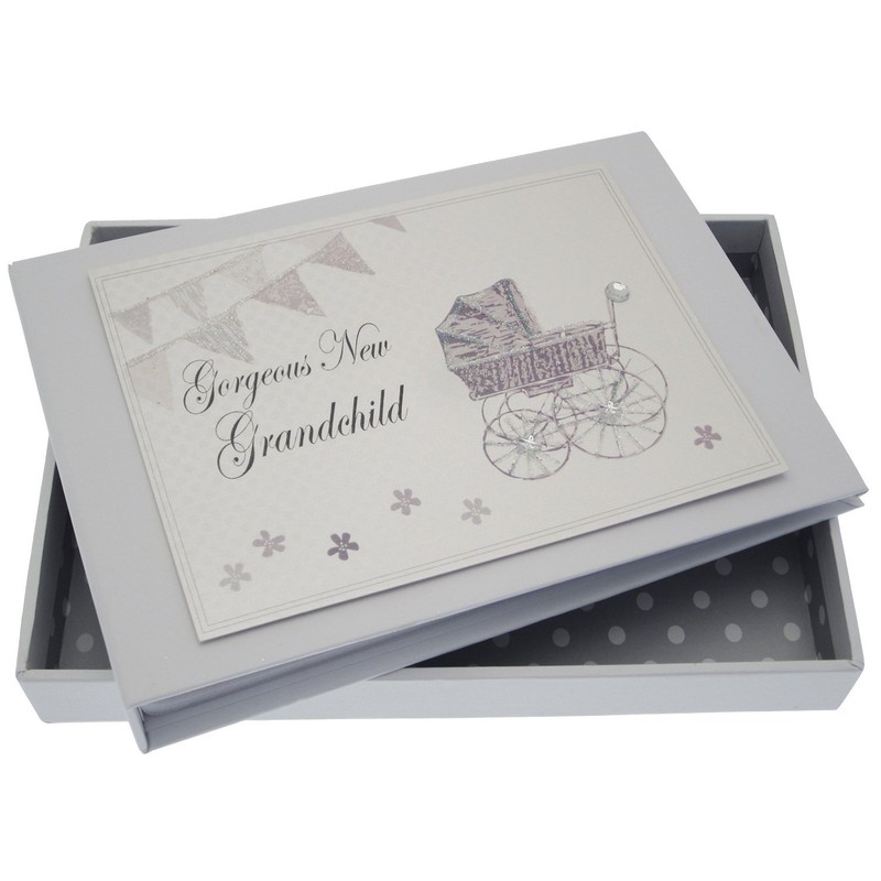 White Cotton Cards New Grandchild Tiny Album (Silver Pram and Bunting)