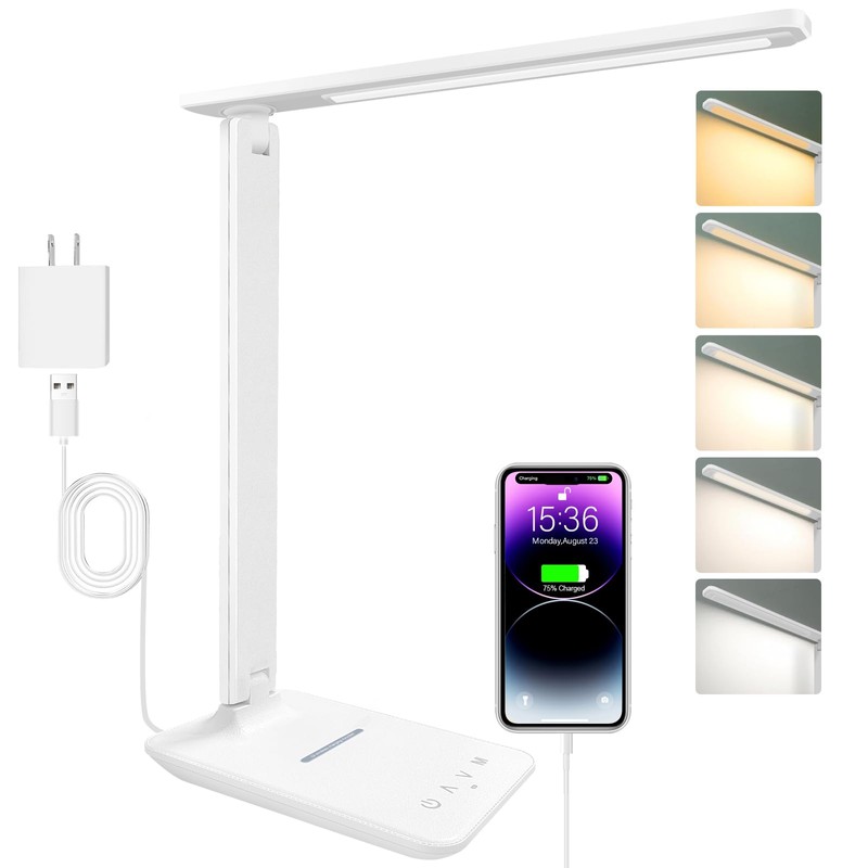 White crown LED Desk Lamp with 15W Wireless Charger & USB Port, Dimmable Table Lamp with 5 Lighting Modes, Sensitive Touch Control, Foldable & Portable Desk Light for Home, Office, Bedroom, Reading