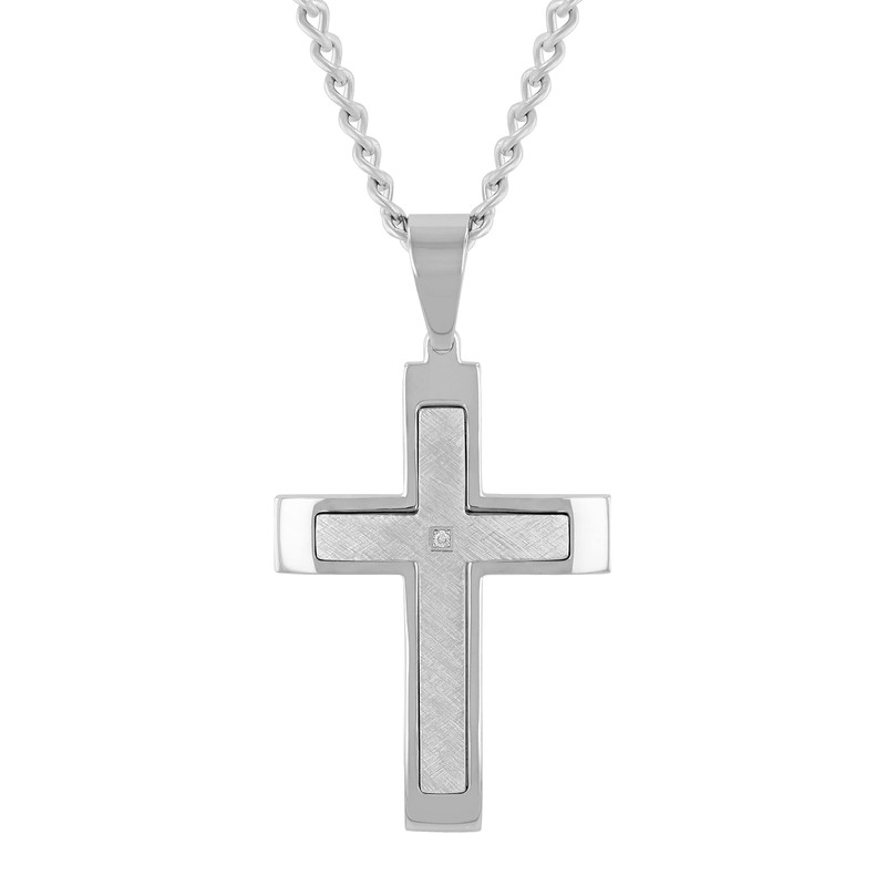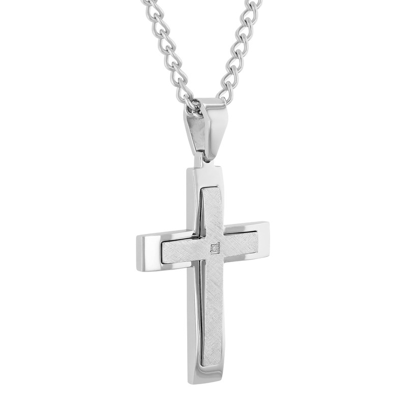 White Diamond Accented Stainless Steel Stacked Cross Pendant on 24" Twisted Curb Chain Necklace (H-I Color, I2-I3 Clarity)