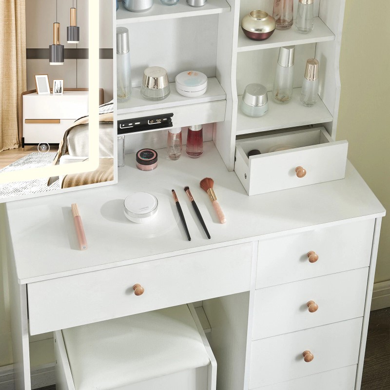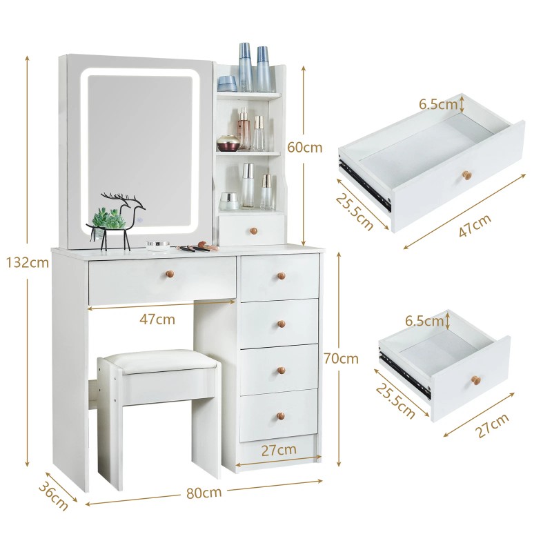 White Dressing Table Vanity Desk With Adjustable Light, Mirror, 6 Drawers, Stool